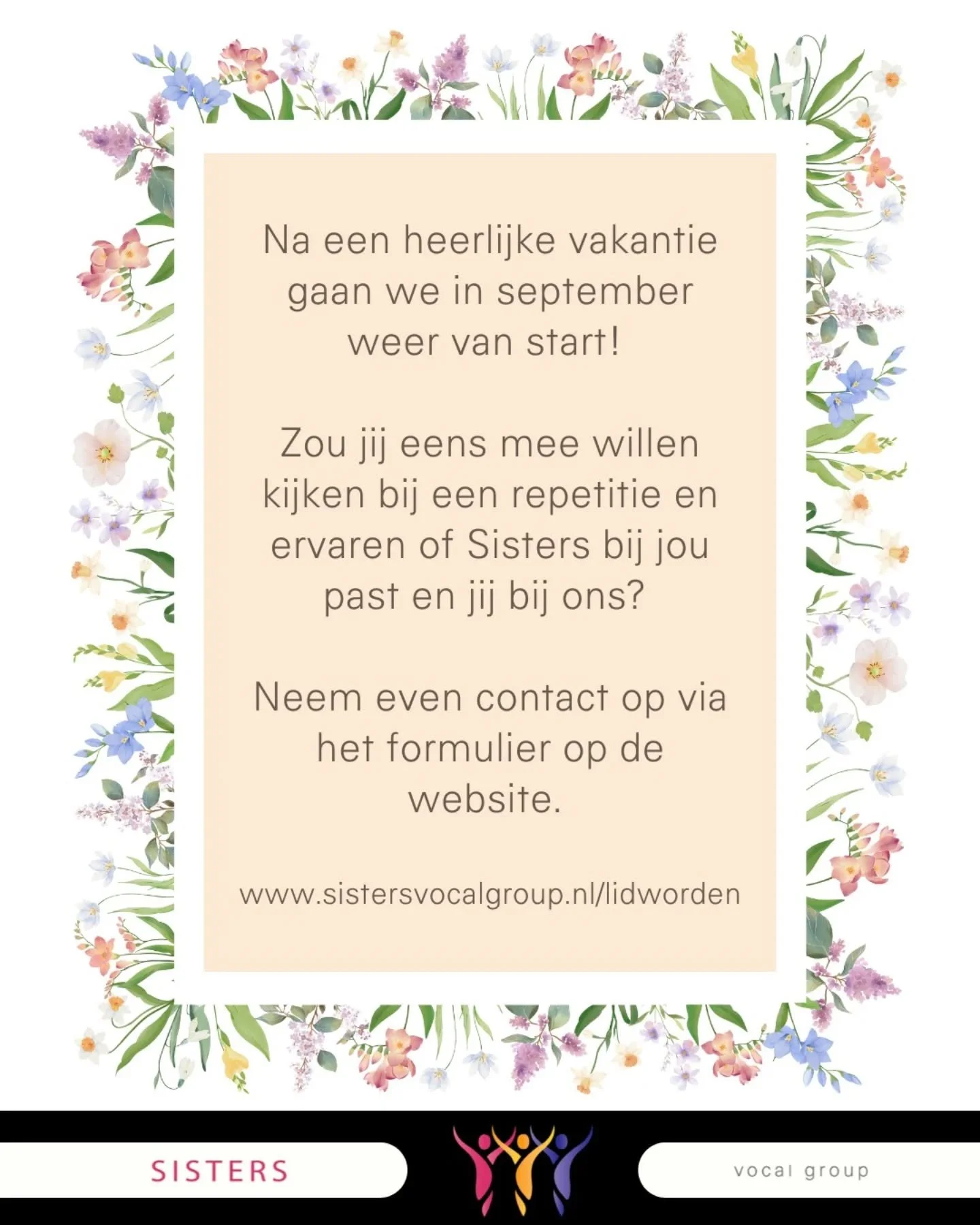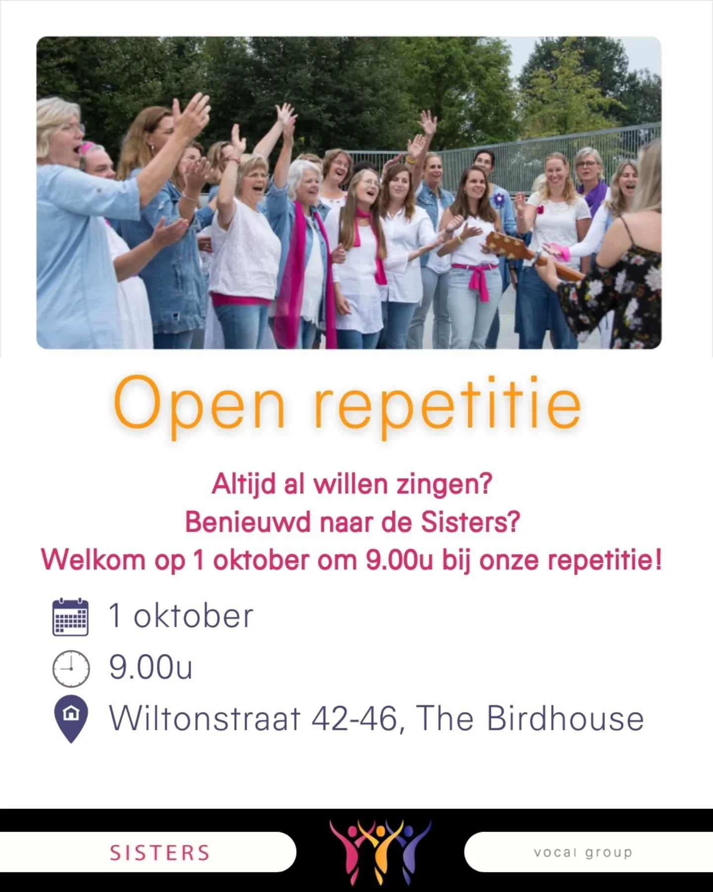Wil je het βSister-gevoelβ ervaren? Je bent van harte welkom om een keer mee te zingen tijdens een open repetitie. De eerstvolgende is januari 2025. Aansluitend kun je je aanmelden voor een auditie. We repeteren in de even weken op woensdagmorgen van 09.15 uur tot 11.45 uur in Veenendaal.